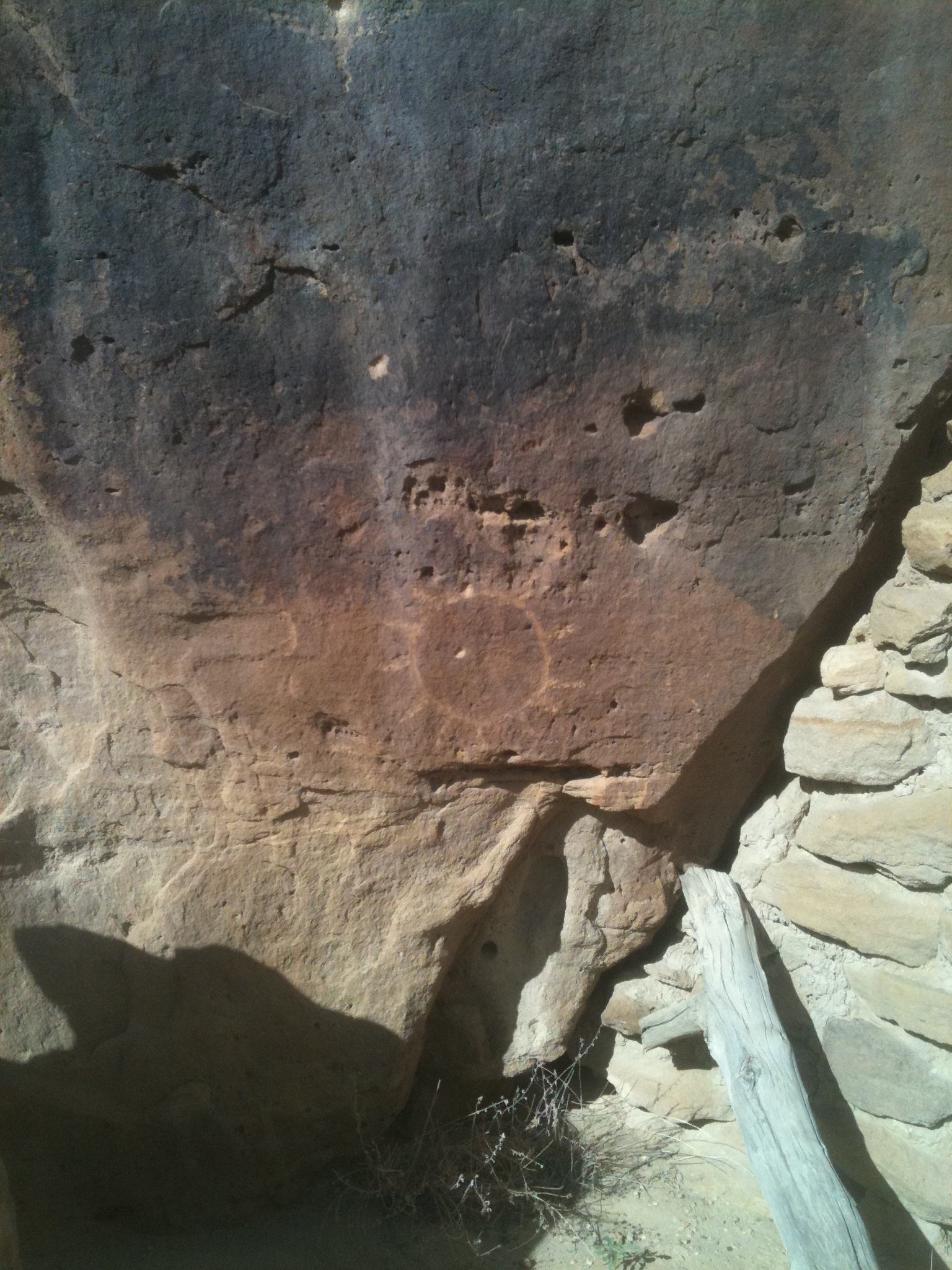 The Pueblitos of Dine’tah were Navajo defensive structures built in the late 1600’s to late 1700’s to defend the Navajo homeland from Ute raiding parties from the north. (I assume the Utes were after their women and corn!) The rock art dates back to the ancient Puebloans of the Chaco culture all the way up thru the Spanish conquistadors and on to the early ranchers who inhabited the canyon. Crow Canyon is probably the best example of this with about a quarter mile cliff band covered with hundreds if not thousands of these petroglyphs and pictographs. Also scattered up in the hills all around the area are stone structures with small doors and windows usually perched on top of a cliff face or rock with toe holds carved into the rock for access. The structures are quite well preserved for being 4-500 years old, some of them still have intact roof structures with fireplaces……